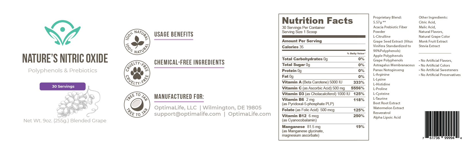 Ingredients: Proprietary Nitric Oxide Booster Blend 3,000mg (consisting of L-Citrulline Malate, Organic Beetroot, Organic Baobab, Organic Pomegranate, Organic Coconut Sugar, Sodium Nitrite, and Xanthine Oxidase.